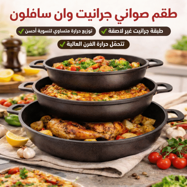 السعر الأصلي هو: 1.100,00 EGP.849,00 EGPالسعر الحالي هو: 849,00 EGP.طقم 3 صينيه فرن جرانيت موديل وان سافلون مدور مزود بيد