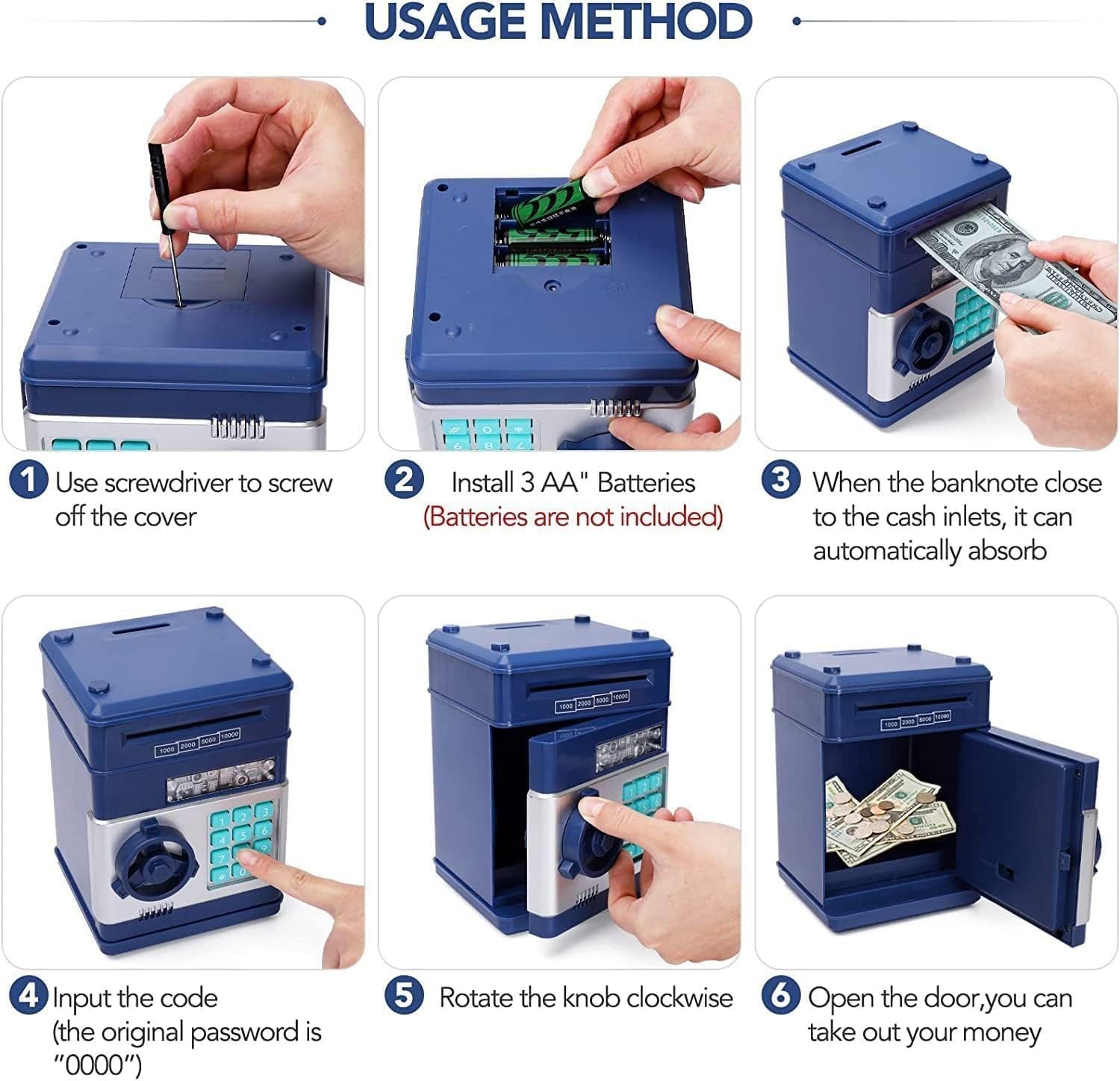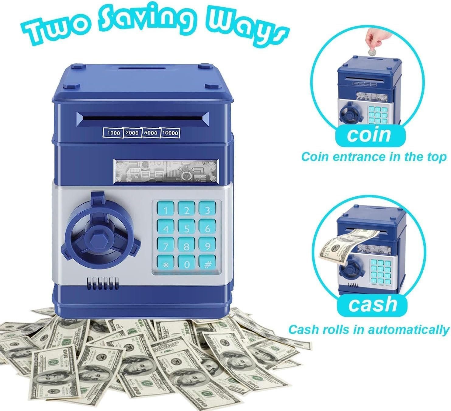 – ما مدى روعة حصالة النقود الورقية هذه لتوفير النقود الورقية/العملات المعدنية مع رمز كلمة المرور الإلكترونية. يمكنها تخزين حوالي 600 قطعة من العملات المعدنية أو 100 قطعة من النقود الورقية بالدولار. إنها أفضل هدية للأطفال لتخزين أموال الجيب والصور! يمكن للأطفال تخزين أموال الجيب لخطتهم، مثل شراء هدية للآباء والأصدقاء والعائلات كمفاجأة