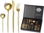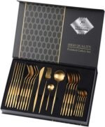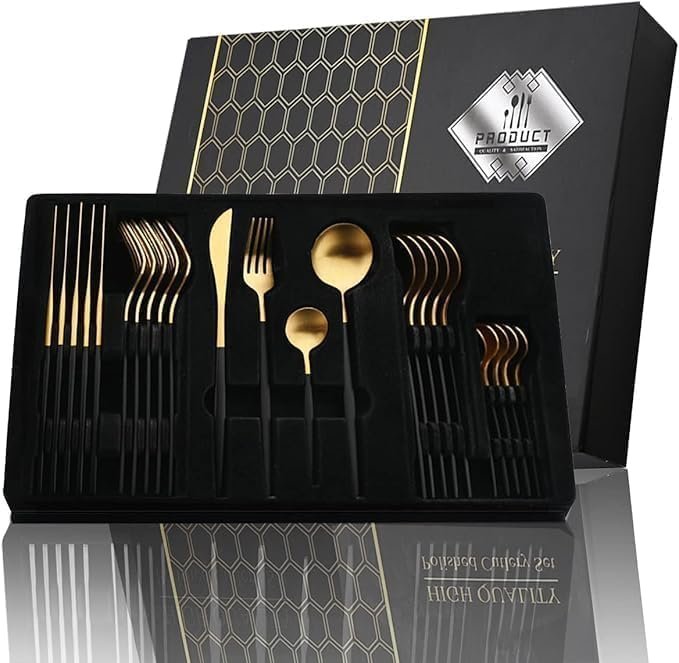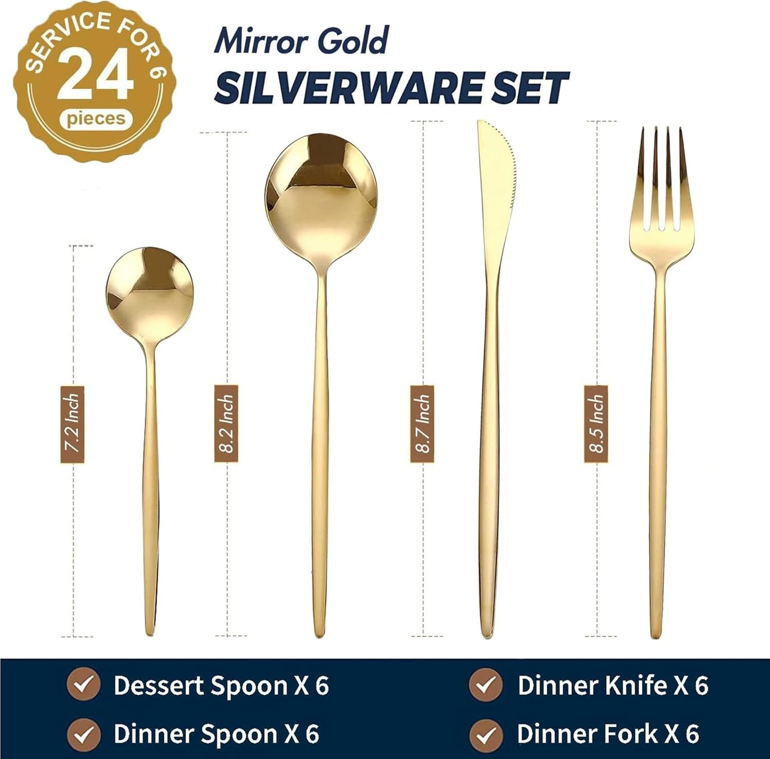 - مجموعة أدوات مسطحة ذهبية مكونة من 24 قطعة مناسبة لـ 6 أشخاص: تتضمن مجموعة أدوات المائدة الذهبية من سويفت 6 سكاكين و6 شوك و6 معالق و6 معالق حلوى. إنها مجموعة أدوات مائدة فائقة الجودة ولا غنى عنها لكل أسرة أو مطعم.