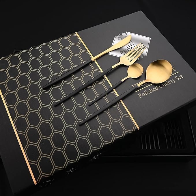 - تصميم عصري وتغليف فاخر: تصميم بسيط وجميل بشكل راقي ورفيع ولمسة نهائية ذهبية تبرز عن الأواني الفضية العادية، مما يُضفي مشهدًا أنيقًا وفاخرًا عند تناول الطعام. يتم تعبئة أدوات تناول الطعام في صندوق هدايا رائع وراقي من سويفت. كما يوفر التصميم الداخلي المبطن بالقطيفة الحماية للمجموعة، ويُعد الصندوق أيضًا مثالي للاستخدام كمنظم رائع لأدوات تناول الطعام. من المؤكد أن مجموعة أدوات تناول الطعام الراقية والعصرية هذه ستكون هدية رائعة.