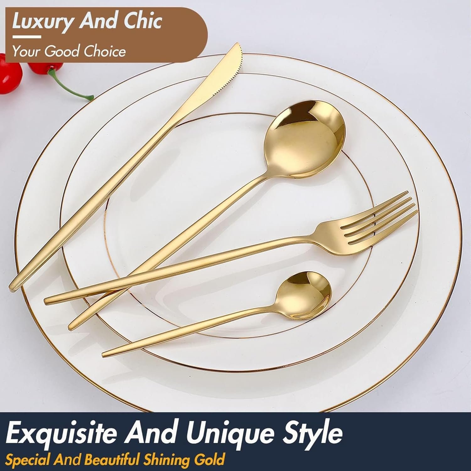 طقم أدوات مائدة من الفولاذ المقاوم للصدأ ومصقولة بلون ذهبى أنيق وعصري مكون من 24 قطعة معالق وشوك وآمنة للاستخدام في غسالة الأطباق