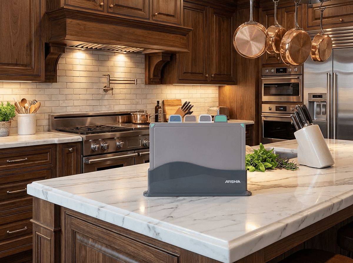 - هناك أربعة أقدام مطاطية غير قابلة للانزلاق على كل لوح تقطيع لمنع لوح التقطيع من الانزلاق.
