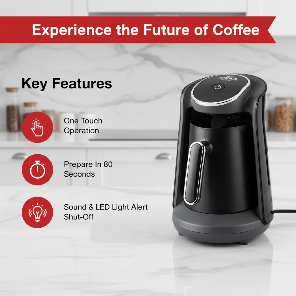 تتميز ماكينة أرزوم أوكا مينيو بقدرتها على تحضير أربعة أكواب في المرة الواحدة. استمتع بفنجان قهوة تركية غنية مثالية في 80 ثانية فقط، إذا كنت من محبي بدء يومك بصحبة أصدقائك أو عائلتك. بفضل تشغيلها بزر واحد، تُعدّ سهلة الاستخدام ومريحة لتحضير فنجان قهوة تركية مثالي. صُممت لتناسب أي مكان في المنزل وتوفر المساحة.