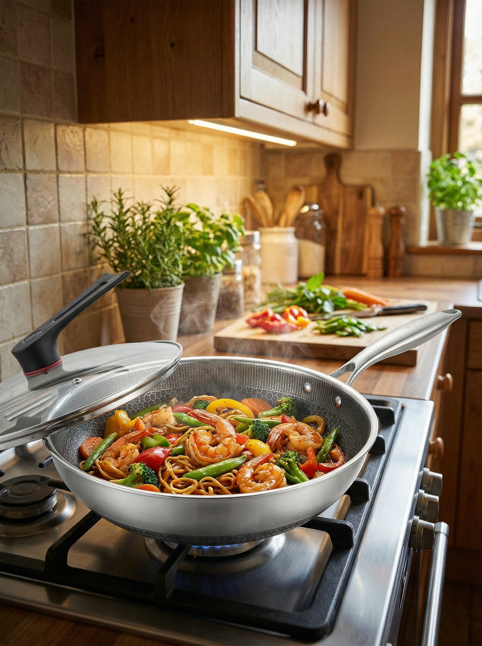 مقلاة ووك غير لاصقة، مقلاة قلي من الفولاذ المقاوم للصدأ 316L، مقلاة ووك أقل استخداما للزيت (32 سم)