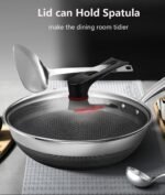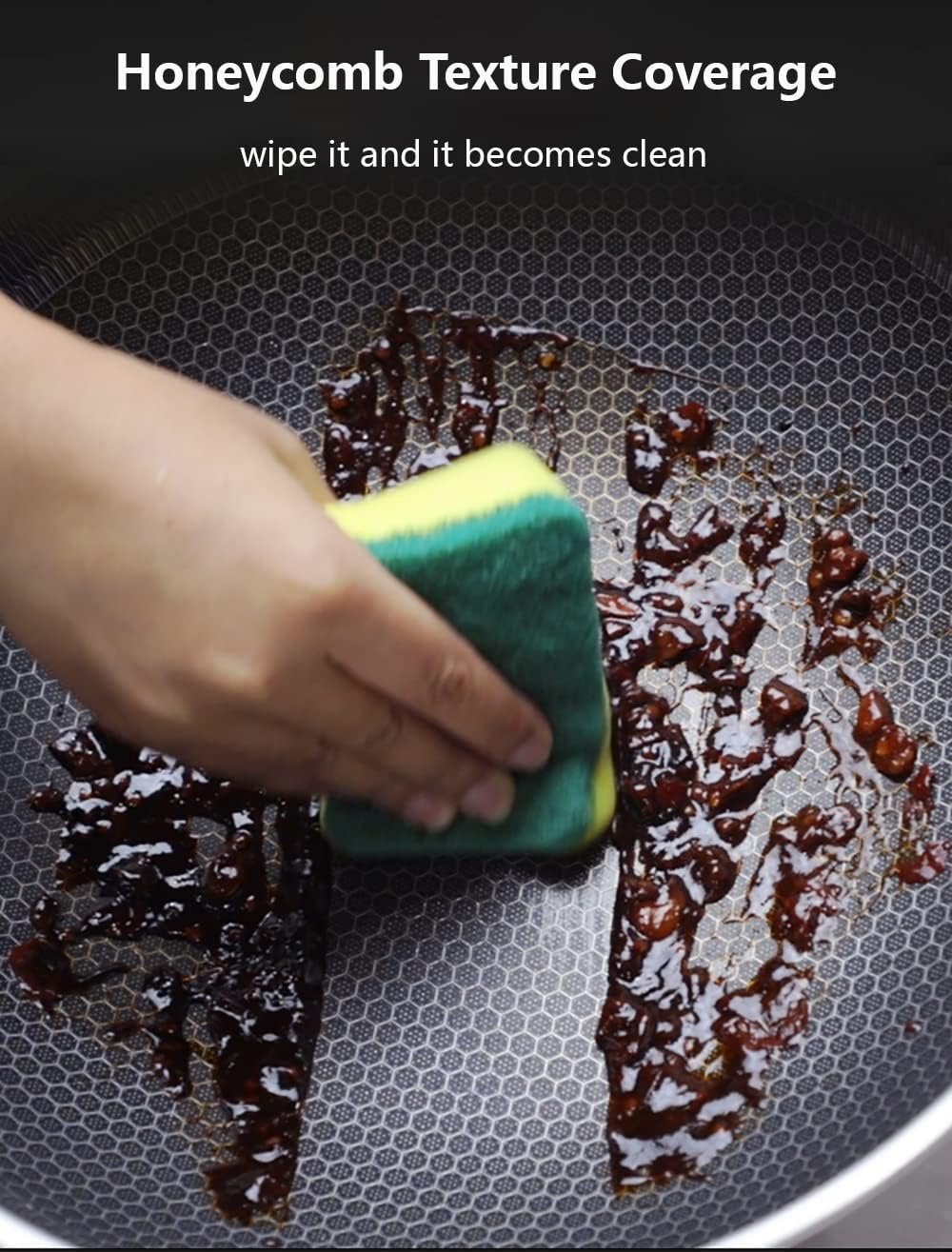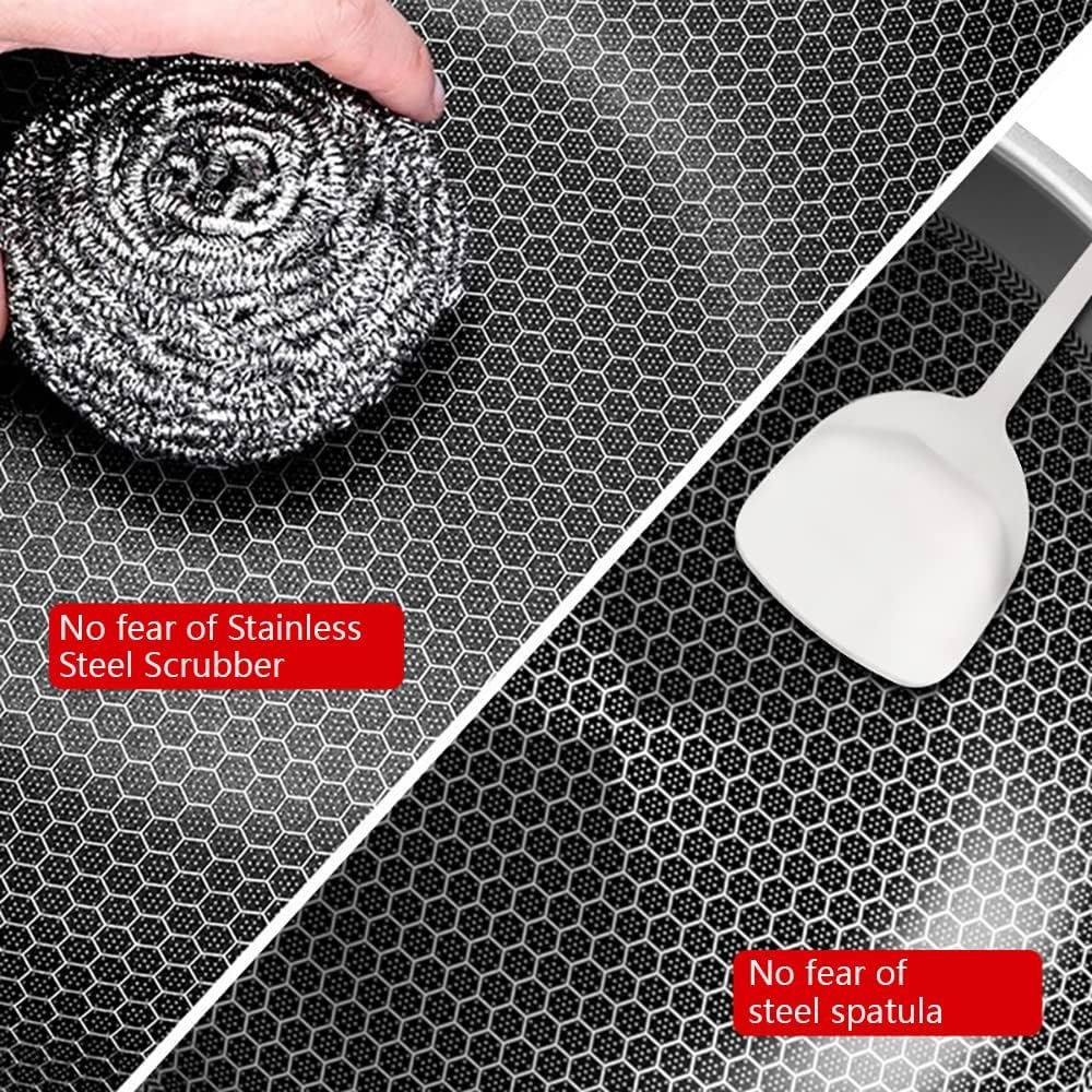 مادة الفولاذ المقاوم للصدأ 316 الآمنة غذائيًا تتحد مع الفولاذ المغناطيسي فائق التوصيل 430، والألومنيوم النقي عالي التوصيل للحرارة، وطبقة غير لاصقة، وملمس قرص العسل من خلال تقنية الصب بالقالب، مما يجعل مقلاة ووك أكثر متانة وصحة. آمنة للاستخدام.