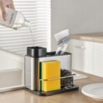 - موزع صابون وحامل إسفنجي 2 في 1: يتميز بعلبة إسفنجية مع مضخة صابون مدمجة لحل غسيل الأطباق الكل في واحد. هناك 3 مساحات تخزين منفصلة للفرش والإسفنج والصابون السائل أو صابون الأطباق. يمكن فكه لسهولة التنظيف.